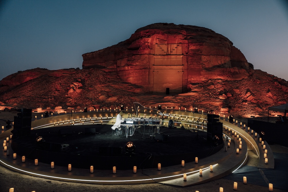 舞台となるヘグラは約2,000年前に築かれ、サウジアラビア初の世界遺産として登録された古代墳墓群。これまでアンドレア・ボチェッリやルドヴィコ・エイナウディなど、世界的な巨匠が選ばれたコンサートである。数千本のキャンドルが照らす世界遺産の静寂に、YOSHIKIのピアノの音色が溶け込むように重なり、幻想的な空間が生み出された。特に「紅」では古代遺跡が真紅に染まり、歴史と音楽が共鳴する光景が広がったとのこと。プログラム中YOSHIKI は「この場所が強いインスピレーションを与えてくれた」と語り、フランス語で“涙”を意味する新曲「LARMES」を初披露。会場には深い情感が満ちた音色が響き渡った。さらに、8月に完成したばかりの新曲「THE SEINE」も演奏された。「ENDLESS RAIN」「紅」「ART OF LIFE」など、代表曲を含む全12曲が披露された。